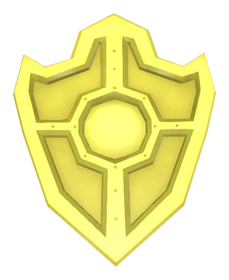 The solid gold shield resembles a large medieval heater shield with a pointed bottom and curved points at the top. It is made entirely of gold, with a golden orb at the center of the shield. The sell value for this item is 325